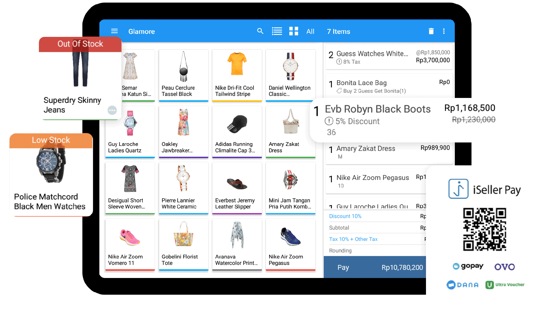 Aplikasi kasir iSeller menawarkan fitur terintegrasi dengan marketplace, inventory management, integrasi pembayaran, dan CRM. Harga aplikasi POS iSeller mulai dari Rp300,000/bulan.
