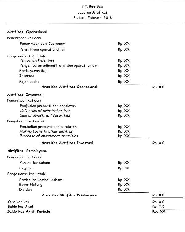 Misalnya transaksi mencakup penjualan dan pembelian aset tetap seperti peralatan atau gedung.