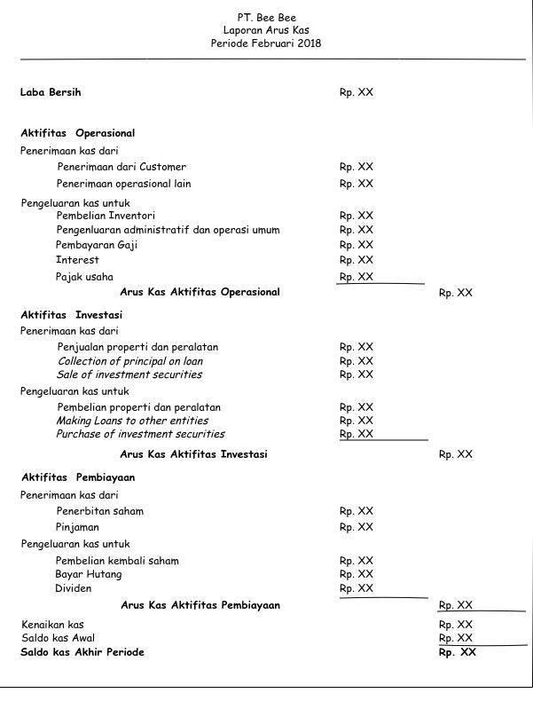 Laporan arus kas disusun dengan tiga eleman yaitu elemen kas dari kegiatan usaha, arus kas yang berasal dari kegiatan investasi, dan arus kas dari kegiatan pendanaan.
