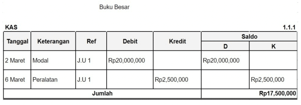 - Buku besar berikut ini hanya akan memasukkan akun kas yang terdapat pada jurnal umum di atas.