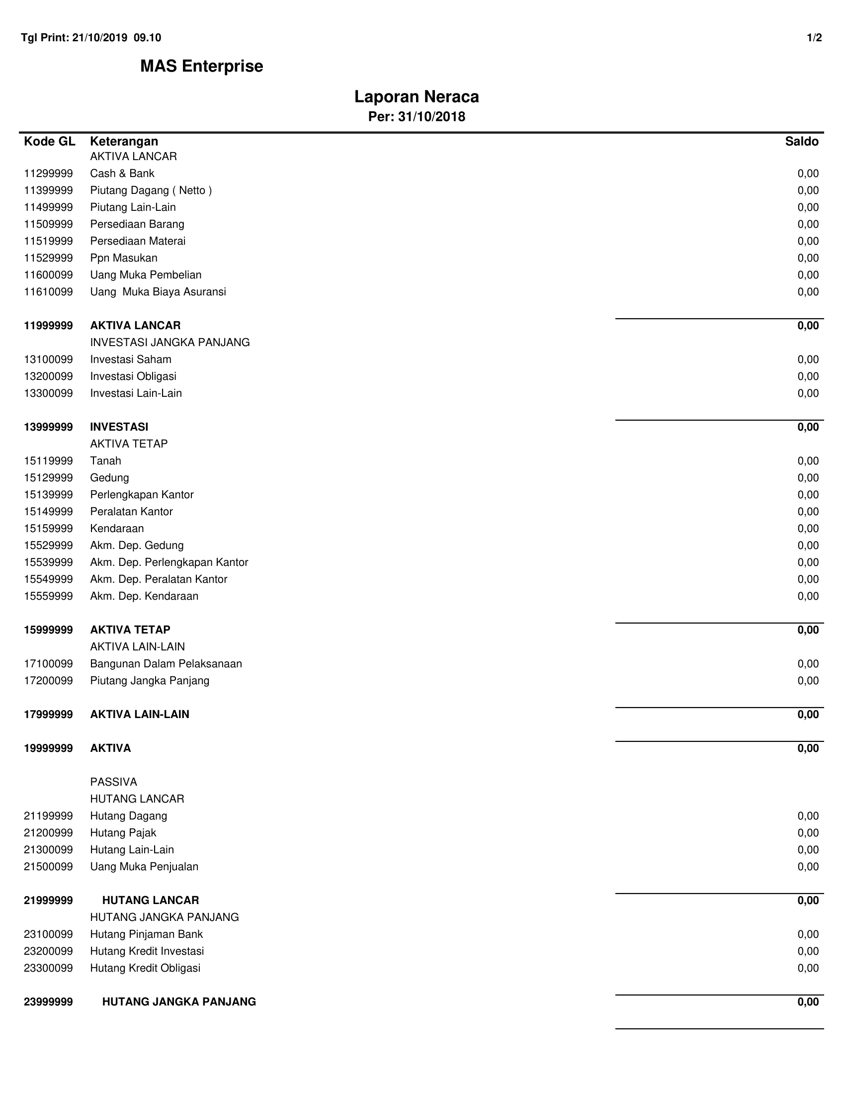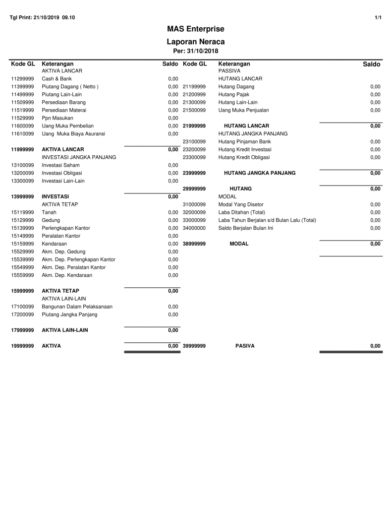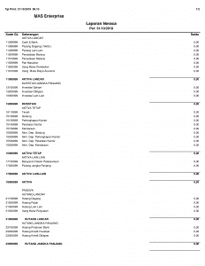 Laporan neraca terdiri dari harta (aktiva) dan kewajiban + modal (passiva). Antara aktiva dan passiva harus seimbang (sama nominalnya).