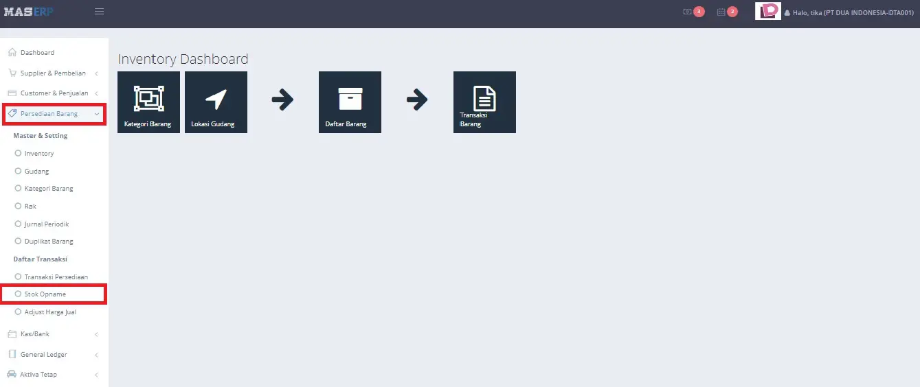 - Setelah log in. Pilih dan klik menu Persediaan. Lalu pilih Stock Opname.
