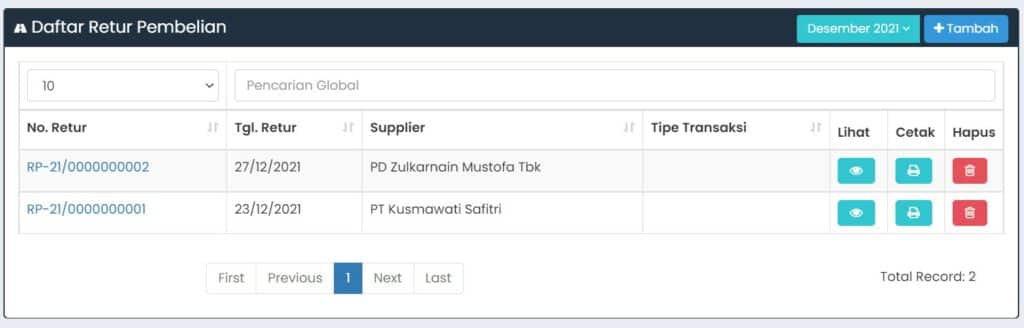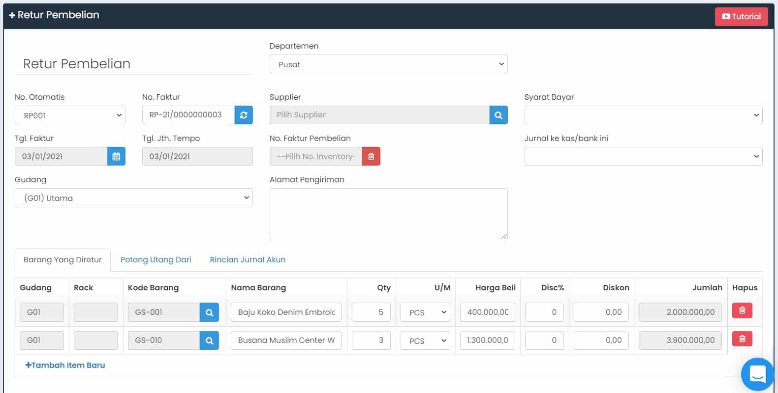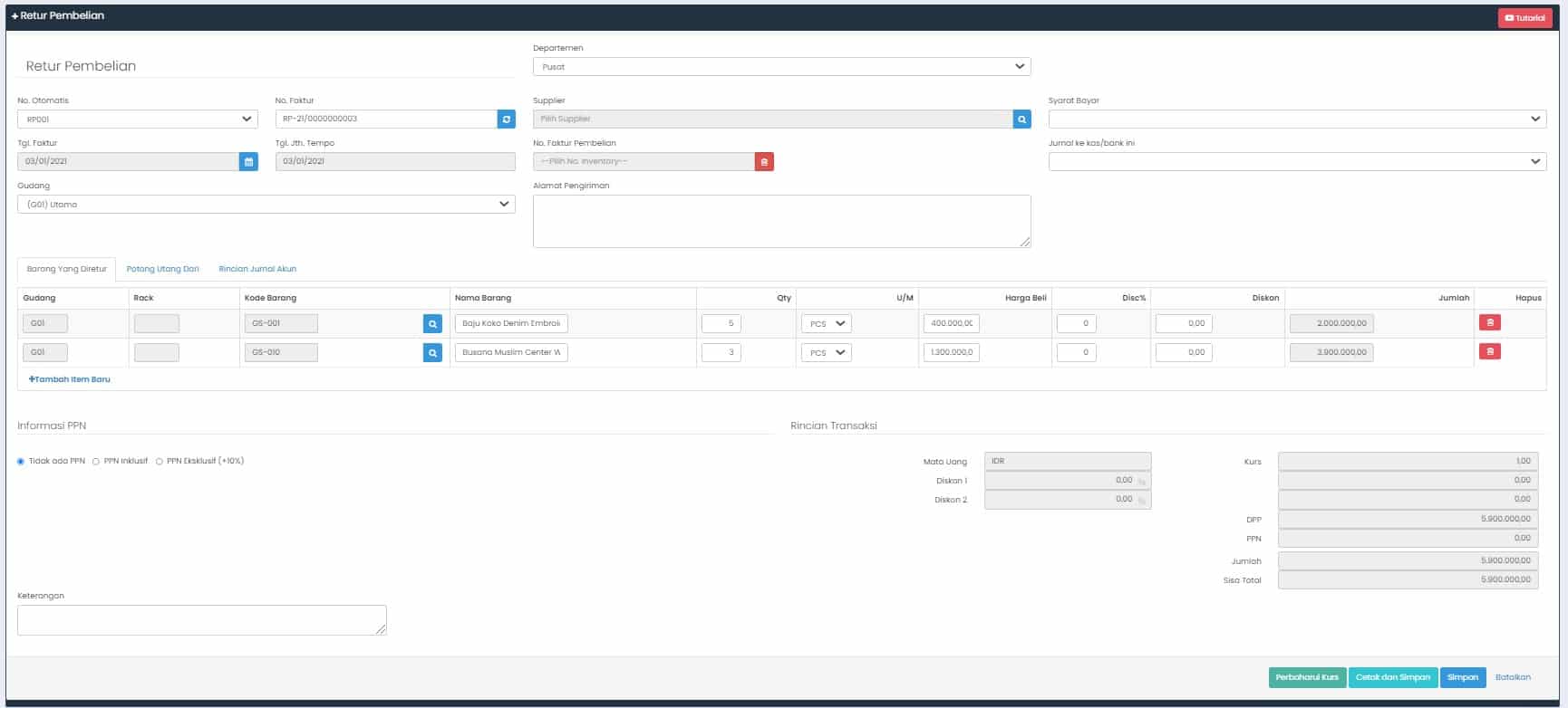 Pengembalian barang ke penjual terhadap transaksi yang belum lunas. Saat dilakukan retur barang otomatis bisa mengurangi hutang pembelian ke penjual.