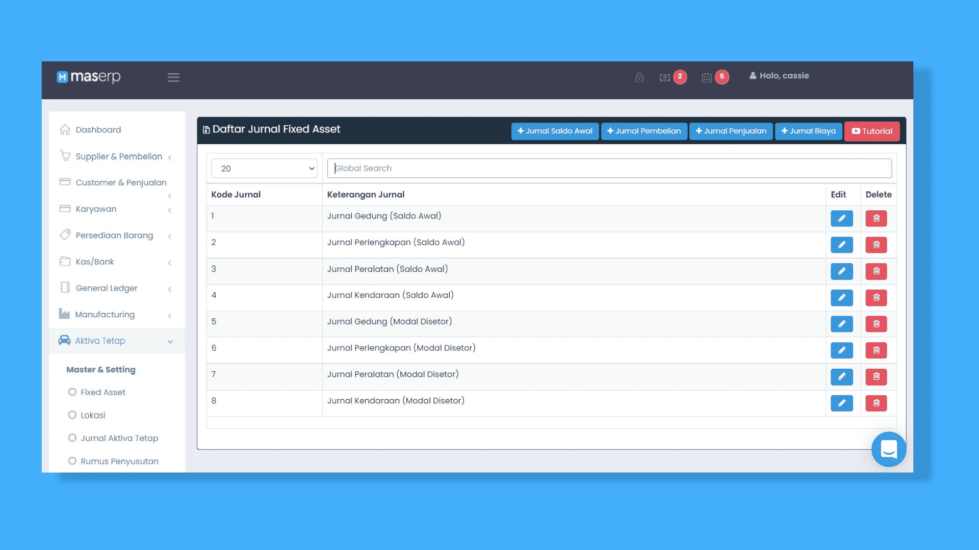 Pengelolaan transaksi aktiva tetap di MASERP berupa pembelian aktiva tetap, penjualan dan biaya aset. Manajemen aset sangat dibutuhkan oleh setiap perusahaan karena akan berhubungan dengan laporan keuangan tahunan dan pajak.