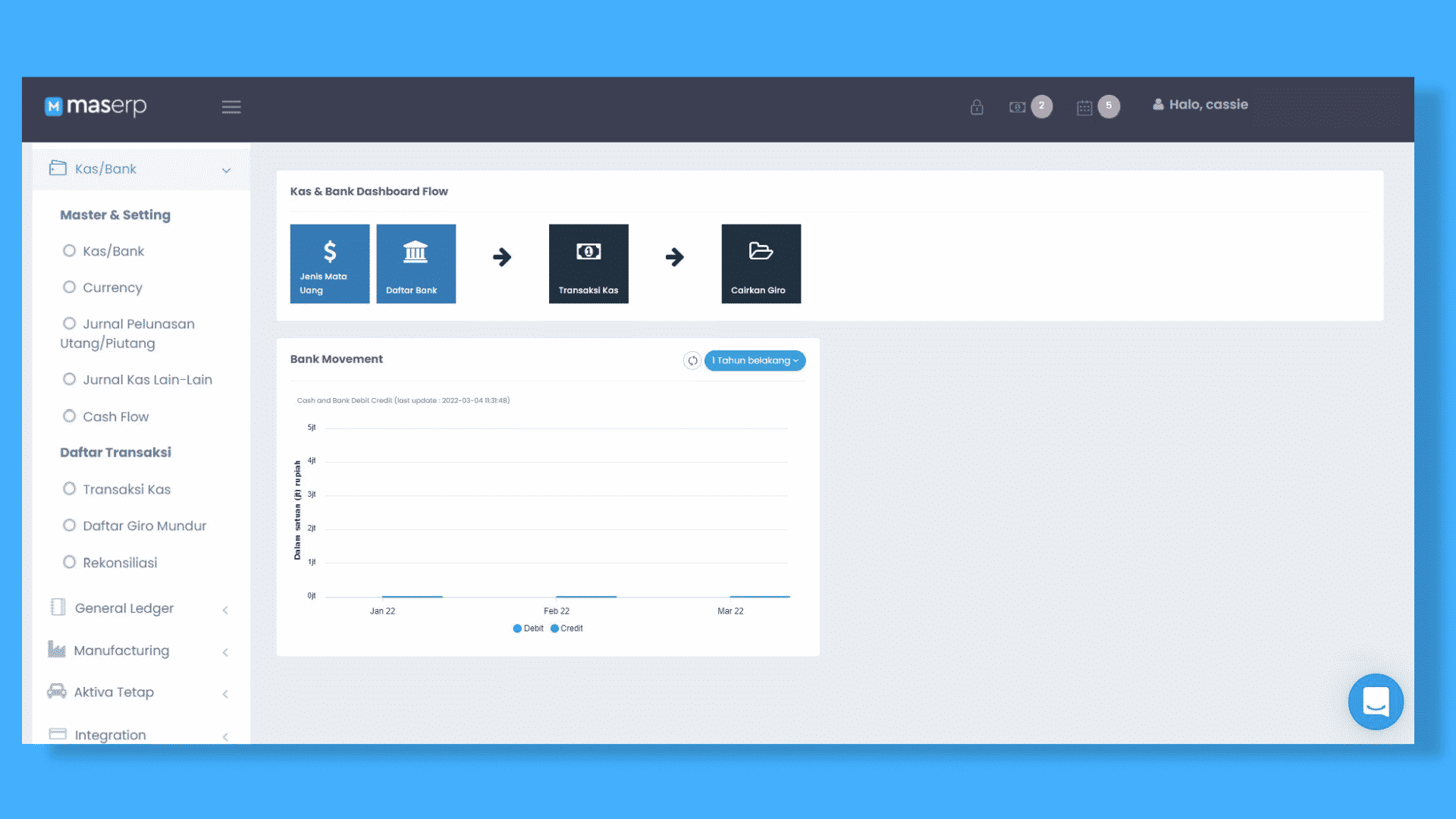 Fitur Giro Mundur juga akan memudahkan dalam pengingat apabila sudah jatuh tempo pencarian. Fitur Rekonsiliasi Bank dan Rasio Keuangan di MASERP juga akan memudahkan departemen keuangan untuk mengelola keuangan perusahaan.