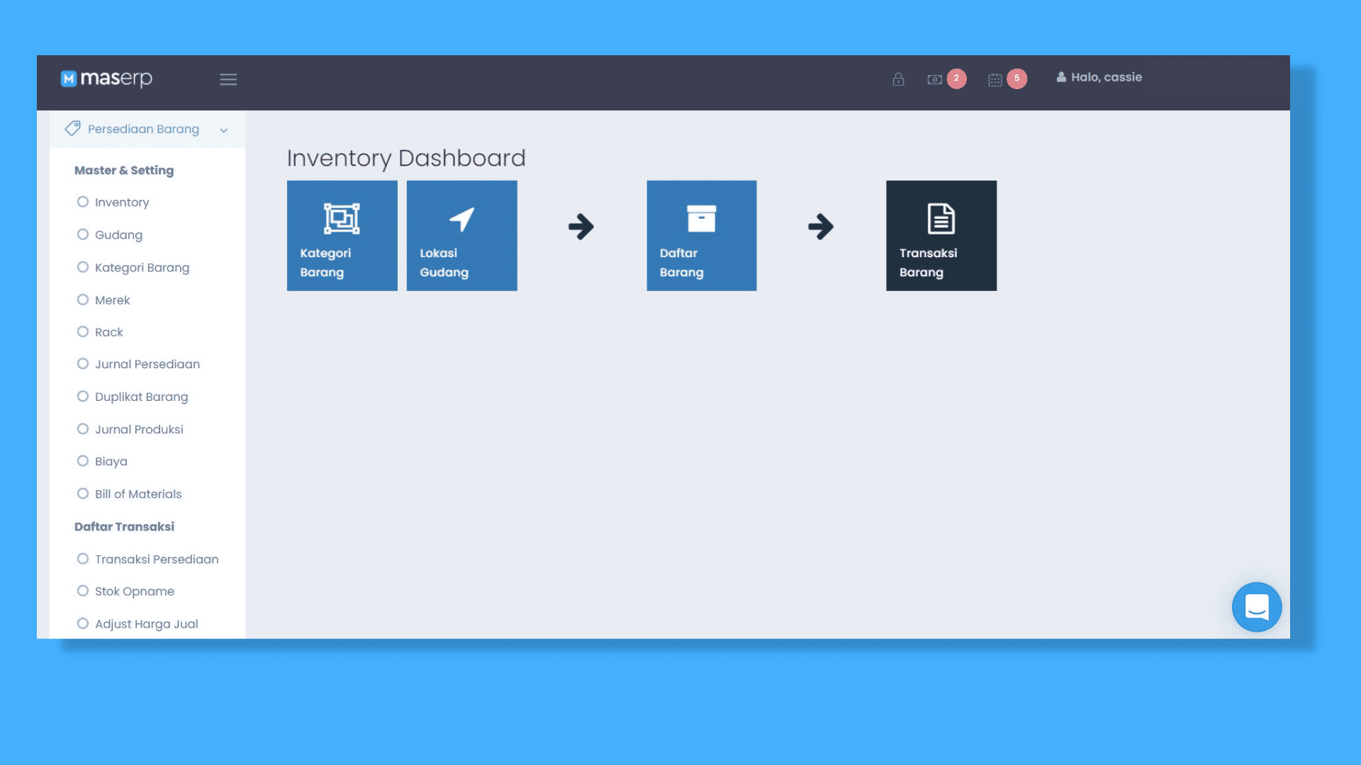 Pencatatan stok barang di MASERP dilakukan secara perpetual dan periodik serta dilengkapi dengan fitur Stock Opname untuk menyesuaikan nilai persediaan berdasarkan jurnal persediaan dan kategori barang.
