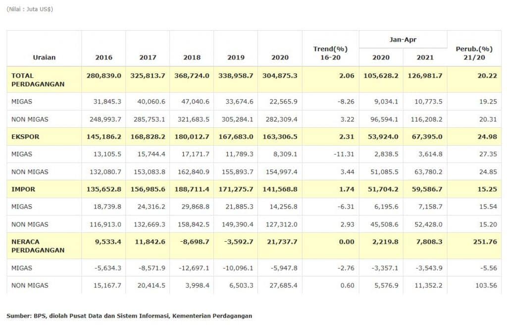 Neraca Pedagangan Indonesia 2016-2021 (Sumber : statistik.kemendag.go.id )