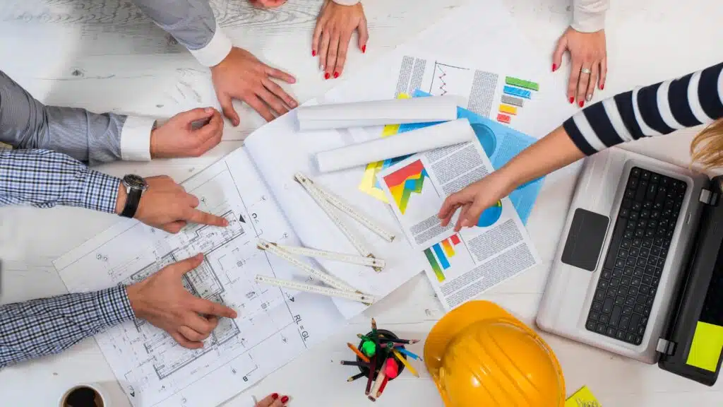 • Design proyek: tahap design dan perencanaan ini, perusahaan konstruksi akan bekerja sama dengan arsitek dan engineer, memastikan proyek yang akan dijalankan dapat memenuhi spesifikasi yang sudah diberikan oleh klien dan mematuhi peraturan yang berlaku (izin mendirikan bangunan, tinggi bangunan, koefisien dasar bangunan, dan lain-lain).