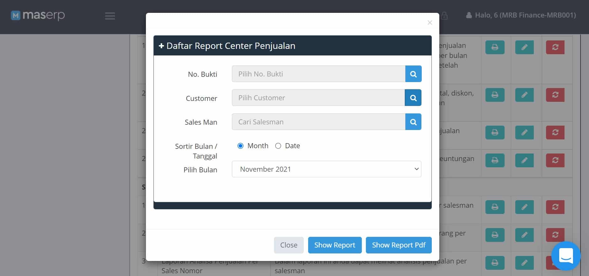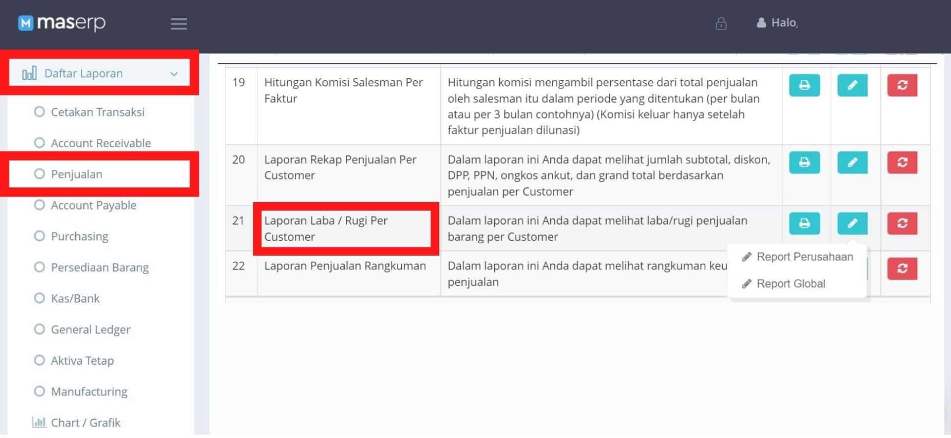 MASERP sebagai software ERP yang memiliki modul keuangan dan ratusan laporan siap cetak juga menyediakan laporan laba untuk perusahaan. Anda bisa melihatnya di fitur Daftar Laporan lalu ke menu Laporan Penjualan.