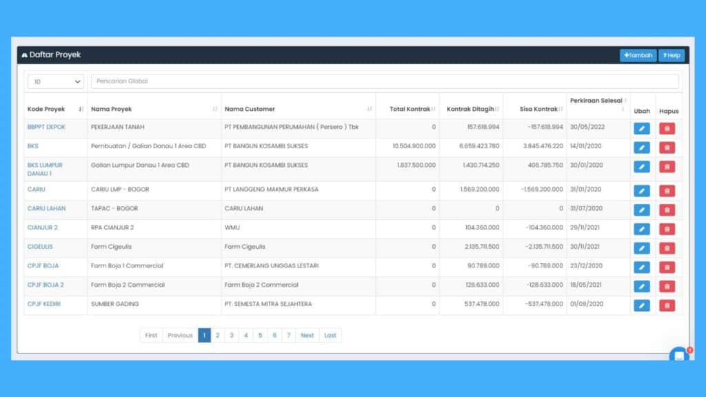 • Master Project: data yang perlu Anda isi sebelum melakukan transaksi billing. Anda harus menginput data berupa nama customer, kode proyek, nomor kontrak, nama proyek, tanggal kontrak, tanggal perkiraan selesai, alamat proyek dan harga kontrak. Semua data master proyek yang sudah tersimpan akan ditampilkan dalam daftar proyek, ini akan memudahkan Anda mencari dan memanage berbagai proyek yang sedang Anda kerjakan.