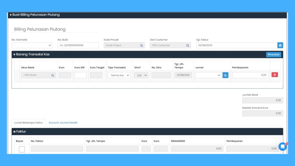 • Transaksi Billing: ketika transaksi Anda akan menginput data nomor faktur, tanggal transaksi, syarat bayar, tanggal jatuh tempo, jurnal billing serta komponen dan nominalnya.