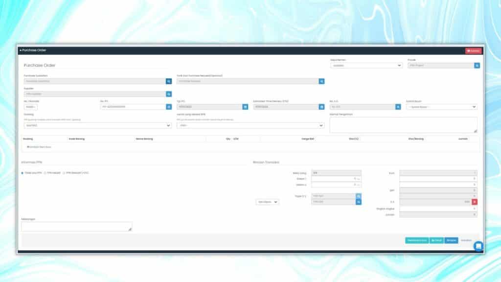 Sebelum benar-benar membeli barang dari supplier, setiap bisnis umumnya akan membuat penawaran pembelian terlebih dahulu. Di sini Anda dapat mengisi data nama supplier, nomor purchase request, departemen yang akan membeli, tanggal quotation, syarat bayar, kode dan nama barang, jumlah barang, discount, dan PPN.