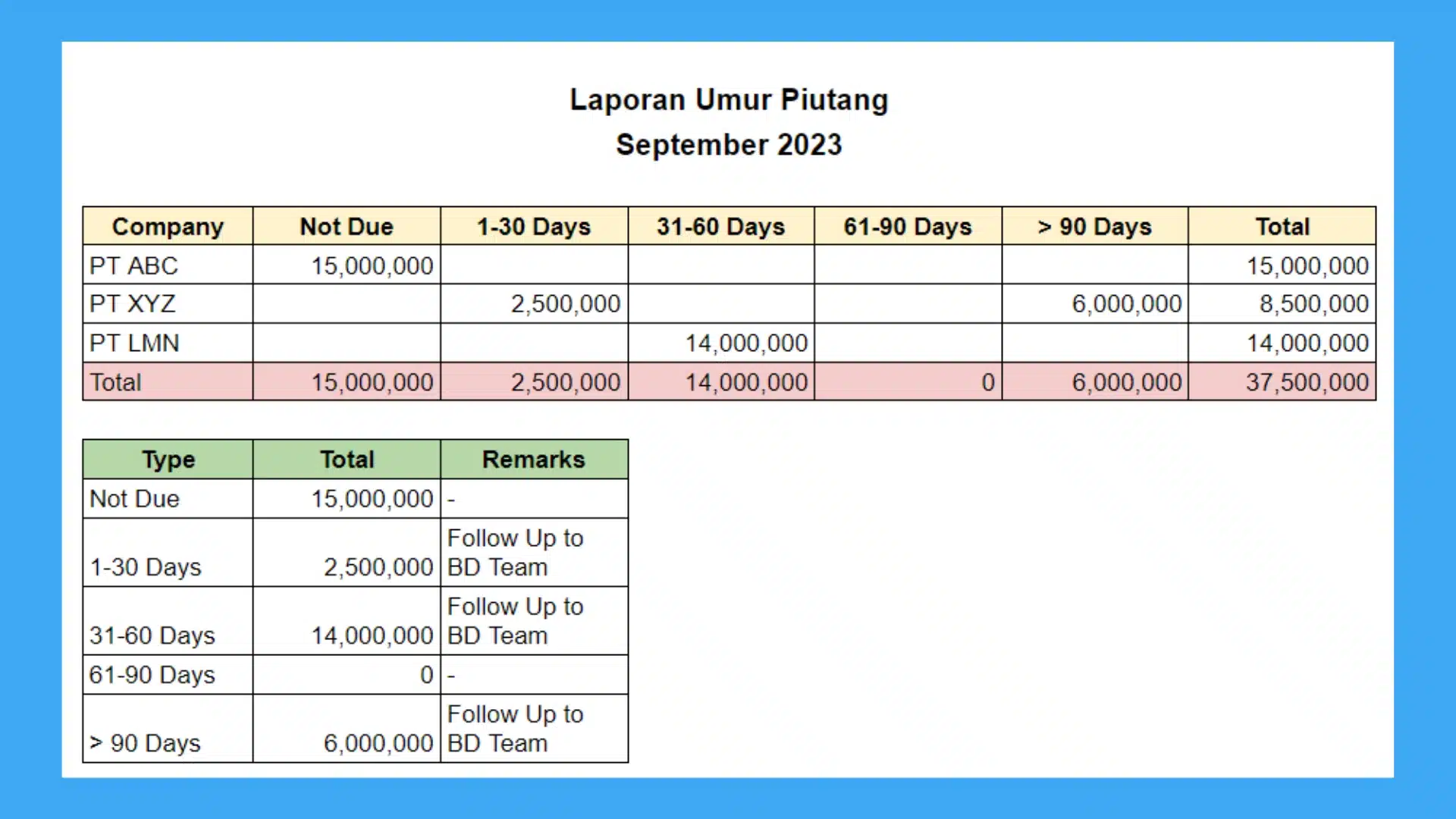 | No | Nama Pelanggan | Total Piutang | Belum Jatuh Tempo | 1–30 Hari Lewat Jatuh Tempo | 31–60 Hari Lewat Jatuh Tempo | 61–90 Hari Lewat Jatuh Tempo | >90 Hari Lewat Jatuh Tempo |
