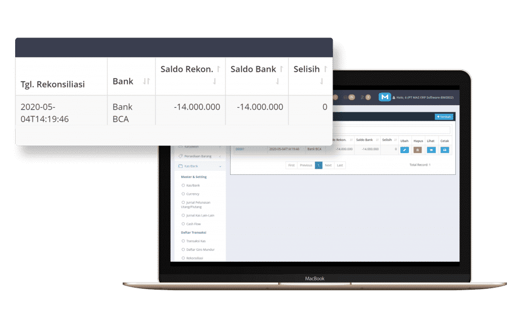 Lakukan rekonsiliasi rekening bank setiap hari dengan mudah dan otomatis, hubungkan software MASERP dengan rekening bisnis BCA Anda.