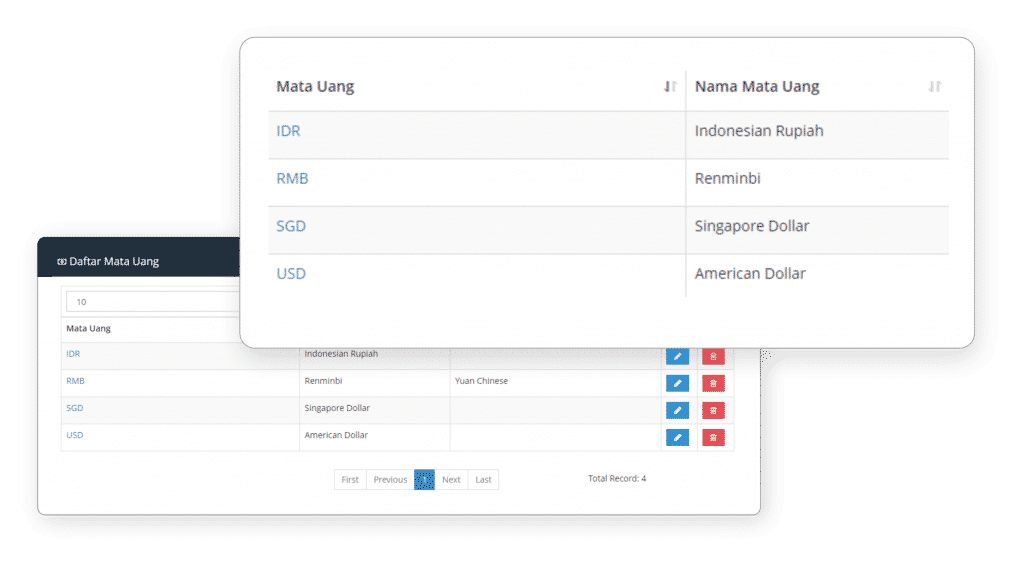 Terima pembayaran dan tagihan dalam lebih dari 160 mata uang dengan MASERP. Kirim faktur penjualan, quotation dan purchase order dalam mata uang asing dan catat kurs rupiah pada hari transaksi.